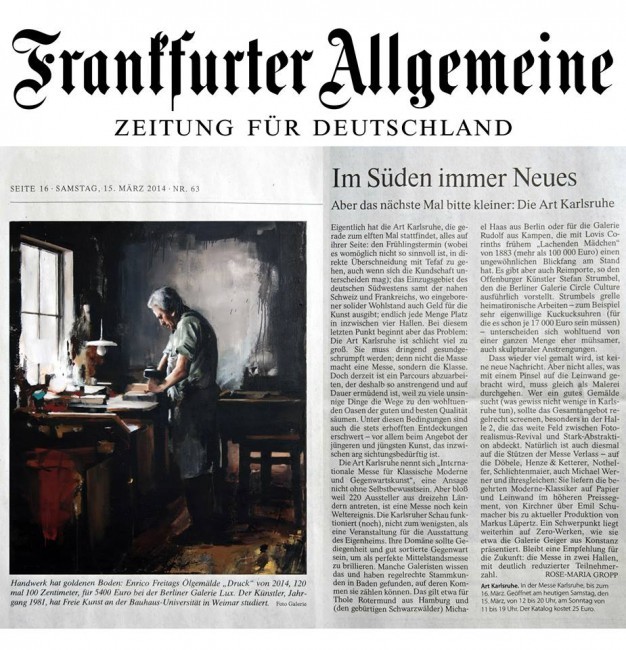 "Handwerk hat goldenen Boden: Enrico Freitags Ölgemälde „Druck“ von 2014, 120 mal 100 Zentimeter, für 5400 Euro bei der Berliner Galerie Lux. Der Künstler, Jahrgang 1981, hat Freie Kunst an der Bauhaus-Universität in Weimar studiert."